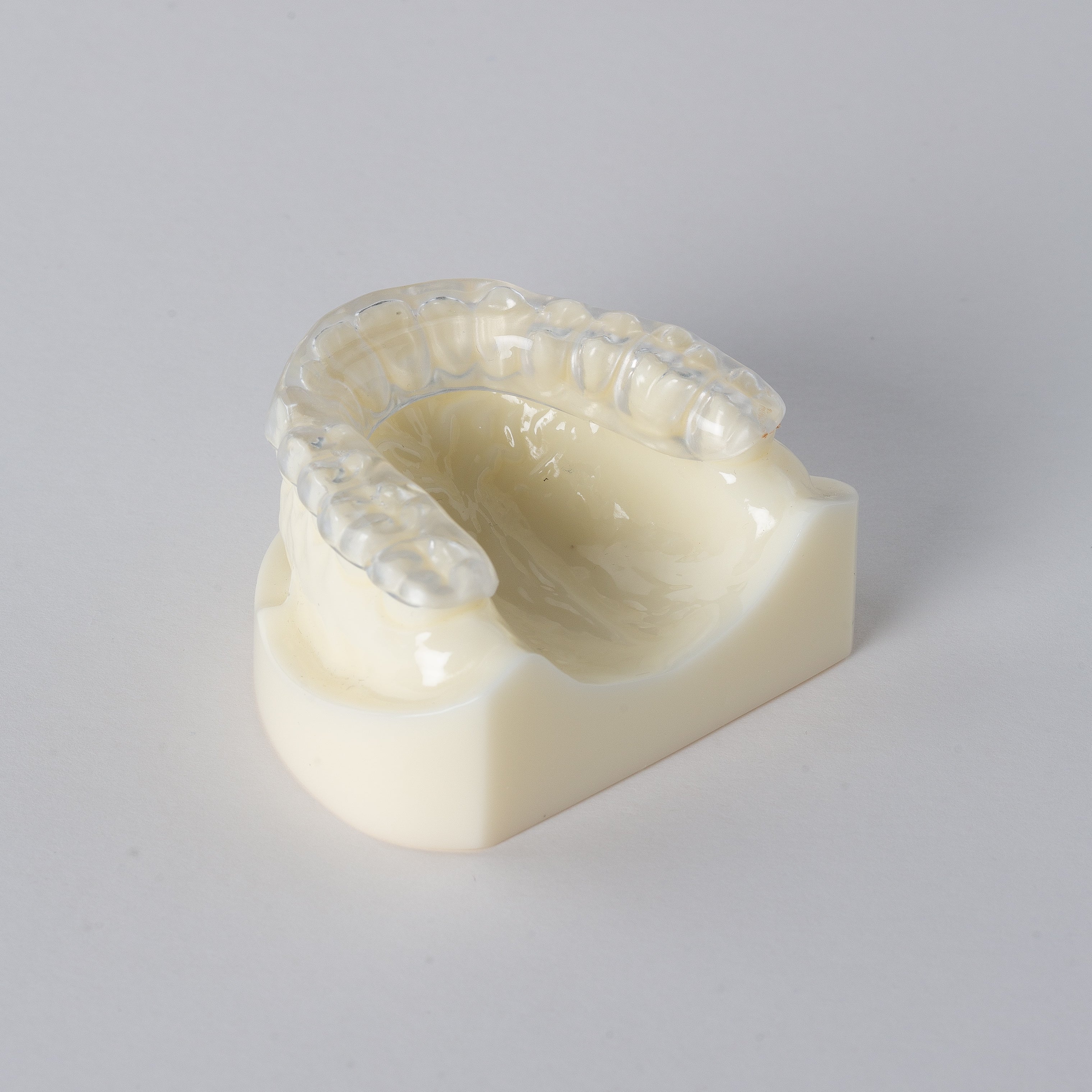 Our guard offers a soft inner lining for increased comfort and a hard outer more resistant to wear. This is often used to prevent damage from grinding, when the patient presents no other symptoms of Bruxism or clenching.